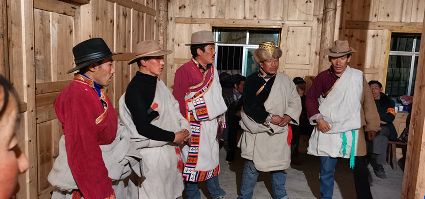 夜臨了,月低垂,整條山谷陷入了藍(lán)色的世界,近處是墨綠,遠(yuǎn)處是淡綠,雄渾的大山在綠的撫摸下也變得婀娜起來;古老寨子的火塘也燃起來了,勞作了一天的普米人聚在一起,跳起了原始氏族人群圍火而舞的傳統(tǒng)舞蹈,曲調(diào)悠揚(yáng)且古樸動人。