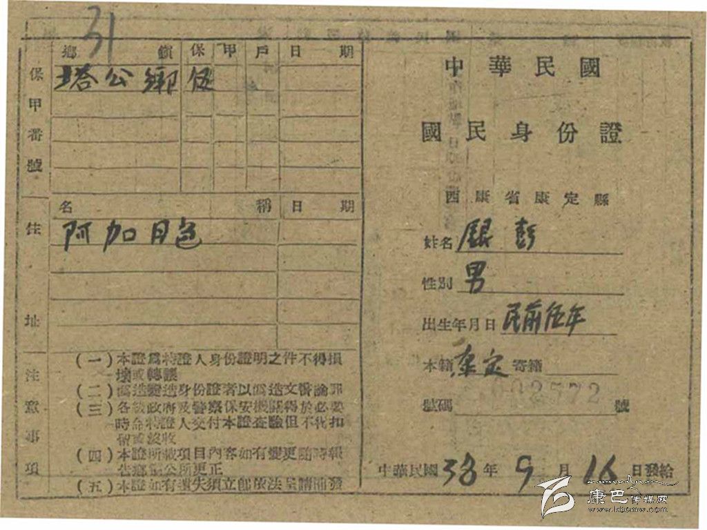 民國(guó)33年,即1944年,西康省民政廳制定《康區(qū)戶口清查辦法》,決定正式清查西康全省戶口。民國(guó)35年,即1946年,康定縣政府對(duì)康定全縣人口進(jìn)行統(tǒng)計(jì)。在1946年時(shí)候,全康定縣共8622戶、36797人,其中男性20889人、女性15908人(不含后重新劃歸康定管轄的所謂“金湯自治局”部分)。爾后開始發(fā)放“國(guó)民身份證”。發(fā)放工作斷斷續(xù)續(xù),延續(xù)數(shù)年,有的人領(lǐng)到,也有的人根本就沒看到過這種“國(guó)民身份證”。