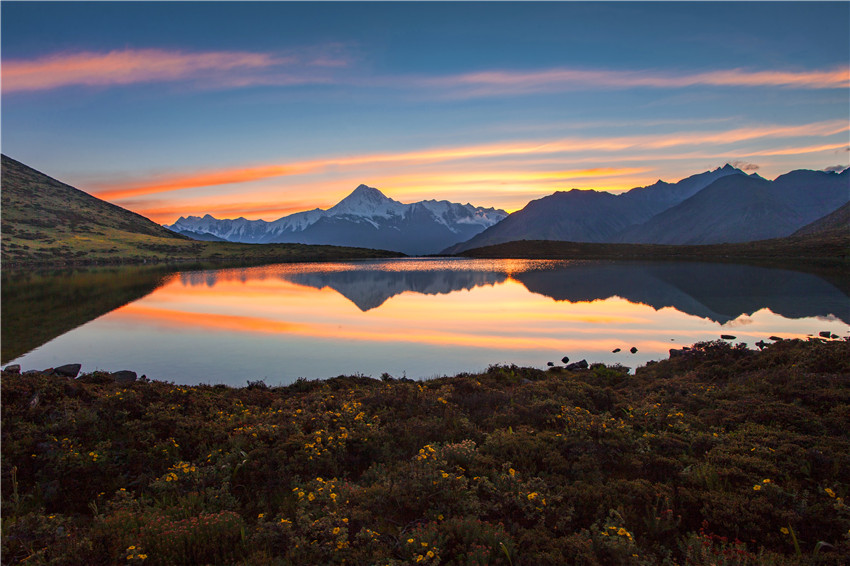 八月的康定本就二十多度,到山上溫度更低一些,加上這里的溪水不比別處的溪流,是雪山融化的水,因此,格外的冰涼。終于到了五色海的邊兒上,整個海子在眼前呈現(xiàn)。此時的五色海對于我們來說,可能不單單是個高山湖泊而已了,在我們抵達五色海之際太陽露出了笑臉,一切都是剛剛好。中午十分撤離五色?;氐叫∧疚荩赃^午飯開始下山。