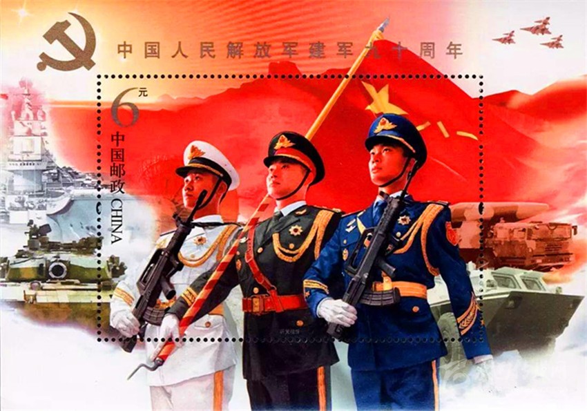 2017年8月1日,中國郵政發(fā)行《中國人民解放軍建軍九十周年》紀念郵票小型張“聽黨指揮”(圖8)。郵票畫面上“八一”軍旗飄揚,各軍種英姿颯爽,背景襯托各軍種高尖端裝備,描繪了我軍戰(zhàn)士聯(lián)合作戰(zhàn)的畫面,既表現(xiàn)了中國人民解放軍威武雄壯的軍容和現(xiàn)代化水平,也表現(xiàn)了在黨的指揮下,人民軍隊忠實履行保衛(wèi)祖國、捍衛(wèi)和平的神圣使命。