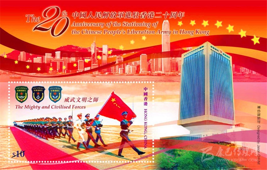 2017年6月20日,香港特別行政區(qū)郵政局發(fā)行了《中國人民解放軍進駐香港二十周年》郵票小型張“威武文明之師”(圖7)。郵票主圖展示的是在“八一” 軍旗引導(dǎo)下,中國人民解放軍陸、海、空三軍儀仗隊的威武風(fēng)采。