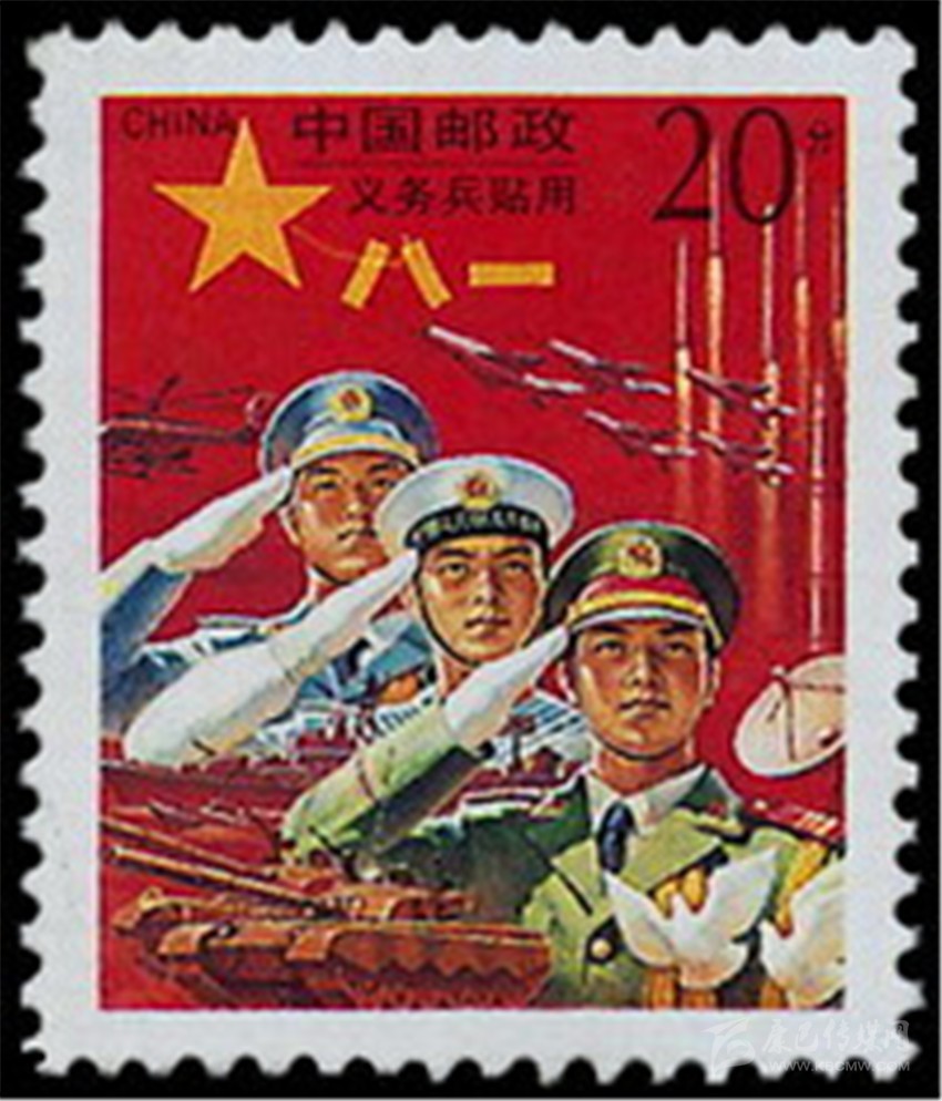 1995年8月1日,原郵電部試發(fā)行一套“義務(wù)兵專用”郵票一套1枚(圖5),票名為“神圣的使命”,圖案以紅光四射的“八一”軍旗為背景,以現(xiàn)代化的飛機、坦克、火箭和象征和平的白鴿為襯托,畫面是威武的陸海空三軍,顯示我軍鋼鐵長城般功無不克、戰(zhàn)無不勝的精神風(fēng)貌。