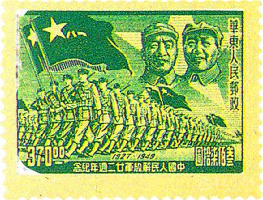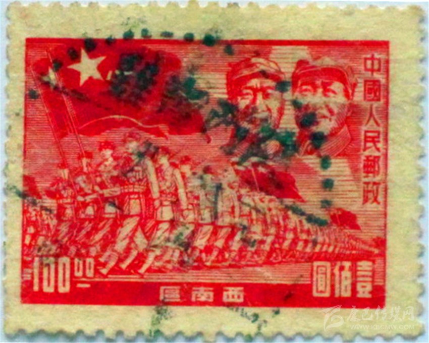 我國最早出現(xiàn)“八一軍旗”的郵票,是1949年8月1日, 剛解放的上海華東人民郵政發(fā)行的《中國人民解放軍建軍22周年》俗稱《華東進軍圖》郵票(圖1),一套5枚,同圖異色異值,郵票右上方為毛澤東主席和朱德總司令頭像,下方是鐵流般的人民軍隊高舉著一面面“八一軍旗”。 同年12月,西南區(qū)人民郵政又發(fā)行一套11枚圖案相同“西南進軍圖”郵票(圖2)。