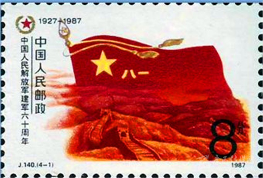 1987年8月1日原郵電部發(fā)行的《中國人民解放軍建軍60周年》紀念郵票一套4枚。其中第1枚“軍魂”(圖4),郵票上一面鮮紅的“八一”軍旗迎風(fēng)飄揚,旗下是蜿蜒的萬里長城,代表了中國人民解放軍是保衛(wèi)祖國和人民的“鋼鐵長城”。