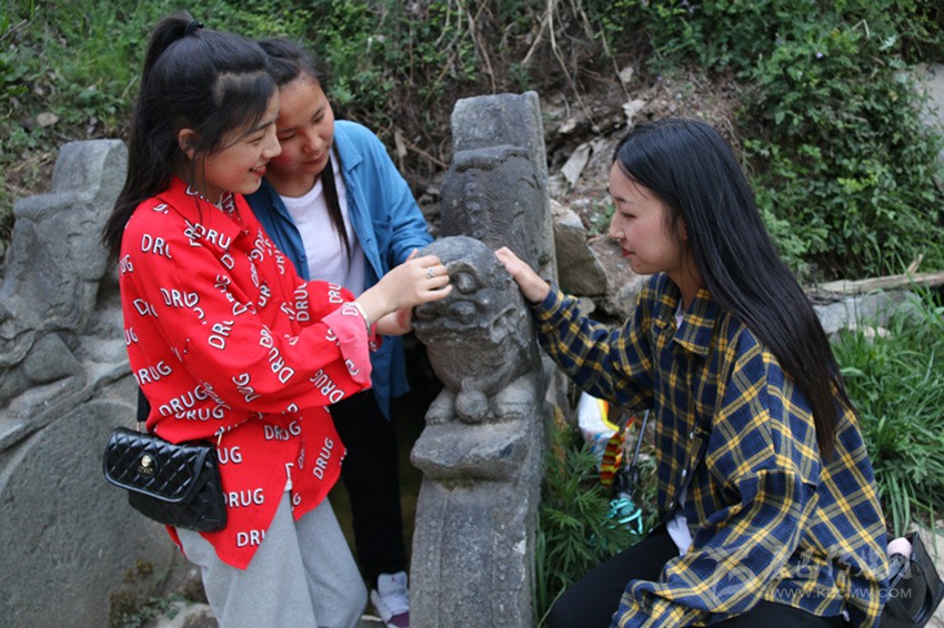 游客金玉鑫(藍色衣服)與同伴在官寨石獅處。