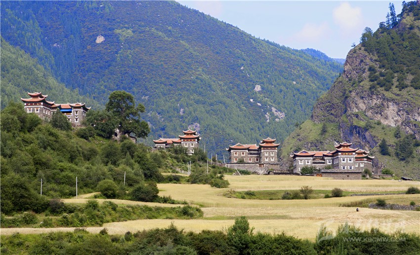 藏寨從大金河谷層層疊疊向上攀緣,在相對高差近千米的山坡上,一幢幢藏式樓房或星羅棋布,或稠密集中,錯落有致。不時(shí)炊煙裊裊、云霧繚繞,詩情畫意。