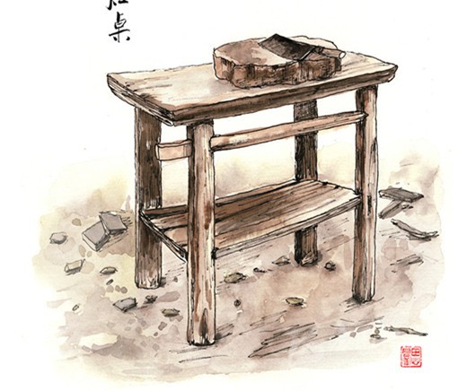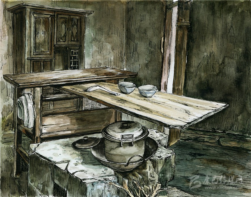 在我們家,灶屋里砌著一個四方形兩灶孔的大正灶,兩條寬板長凳靠墻擺放,交于墻角,像木匠的大曲尺,半圍著象征一家之主的正灶,其中一條正對著灶門口。灶與凳之間的通道,僅容曲膝而坐。灶上常年擱著烏黑的鼎灌和鐵鍋,灶的背面則立著一張長條狀的灶桌。灶桌是洗碗和切菜的地方,在其橫長的縫隙里插上接手板,懸空于灶面之上,擺上碗筷,又起到了飯桌的功能。灶屋進(jìn)門的另一面墻,靠墻而立的,是高高的碗欃和一個瓦水缸。碗欃是平素放碗放剩菜的地方,本是漆了老紅色,卻因西墻的木格窗小,光線幽暗,與四壁及樓板的烏黑融為了一體。水缸上口有一塊擱板,板上放兩只寬口瓦缽,缽里各放著一只竹筒水勺,一大一小。每天早晚,家人擔(dān)了木桶,挑來井水倒入水缸,此處的地面,長年潮濕。灶屋是我們一日三餐吃飯喝茶休息閑談的場所,煙火歲月,多是在此度過。我開蒙上小學(xué)后,每到夜晚,吃過飯后,將煤油燈盞移到寬板長凳,雙膝跪地,伏在凳灶之間的空隙里寫作業(yè),有時一不小心,額前頭發(fā)就被燈盞的火焰燒得焦臭。我自小愛學(xué)習(xí),成績很好,每學(xué)期都有獎狀,老師夜里來村間家訪時,也常來我家坐,是我父母最大的榮光。