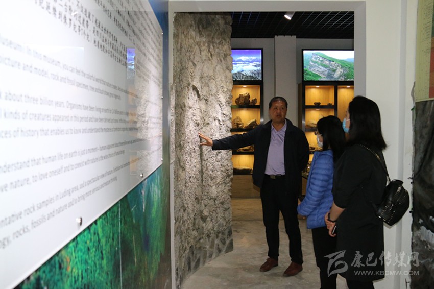 黎國朋在博物館向客人介紹瀘定地形地貌。