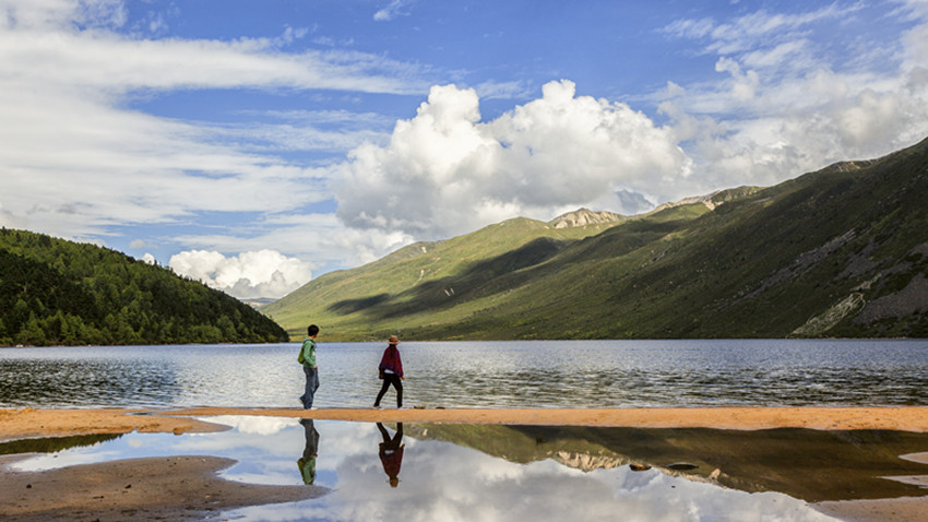 木格措特殊的位置和完好的生態(tài),造就了“一日四時景、早晚不同天”的自然奇觀。高原的第一縷晨光越過遠(yuǎn)峰,均勻地鋪灑在木格措湖面,湖水蘇醒過來,水面煙波浩渺,薄紗飛卷,如同早起后對鏡梳妝的仙女。午后有微風(fēng),遠(yuǎn)處湖面靜若處子,近前卻有微瀾拂岸,動靜之間,盡得自然自在。斜陽西下,余暉投灑在水面上,湖水濃墨重彩,任意涂抹,水天一體,你我也融合在靜謐的湖光夜色中了。