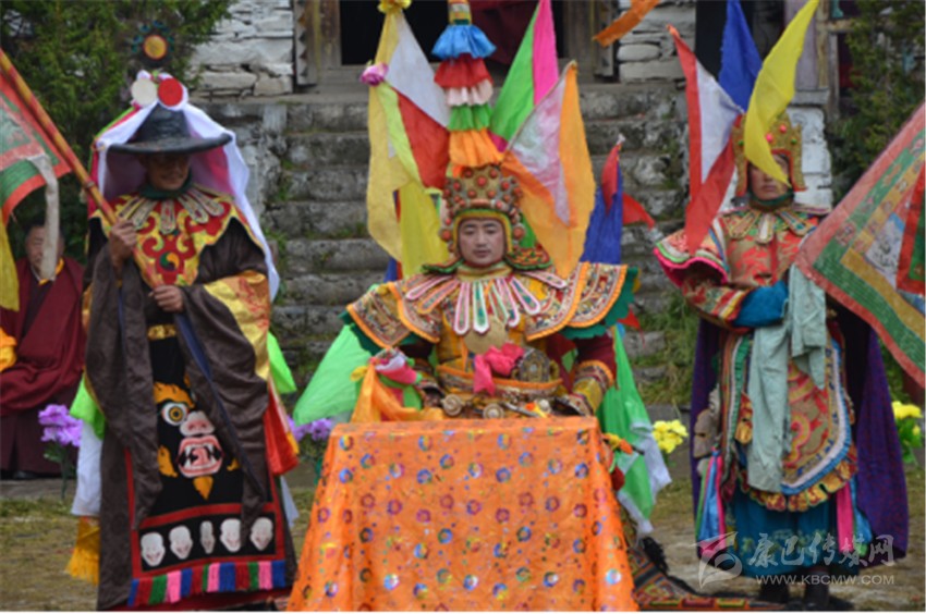 思路還是回到戲劇問題上來,在我以往欣賞的藏戲,其演出場所都設(shè)在露天,演員和觀眾在同一平臺的草地上,有時在平臺四周有山坡,那便是觀眾最好的看戲處。不過,從高處往低處看,效果還是不及平視的效果好。表演藏戲的舞臺在草地中央,觀眾圍著中央草地形成一個半包圍圈,演出幾乎沒有布景,即便有,也是簡單的一些桌椅、祭臺之類的簡單道具。在演出中,一個演員身著各類色彩鮮艷的帽、旗及其盔甲服裝等大于人體體型的飾物,這樣做的目的顯然是為了增強演出的鮮明性,尤其演員穿著厚底高靴,體型龐大,頭戴面具,嗓音洪亮,動作凝重而富有節(jié)奏,使整個演出富有較強的穿透力和沉重感。藏戲的音樂也比較簡單,主音節(jié)奏依靠長號、大鼓、鈸等,曲目轉(zhuǎn)換時則多以笛子演奏,間或插入海螺聲、嗩吶聲等。整個藏戲的故事情節(jié)則是依靠舞蹈和合唱來漸次推進的。藏戲作為祖國文化大家庭中的成員之一,自然有著自己獨特的特點,有著屬于自身的文化藝術(shù)和生活土壤的傳承因子。藏戲誕生在一個特殊的環(huán)境里,它既在風(fēng)格、形態(tài)、特征和韻致上包含著與其他戲劇相似的共通性,同時,它又蘊涵著與眾不同的自身的內(nèi)涵特征??傊貞蛟凇案?、舞、劇、技等方面的有機結(jié)合,虛擬寫意的表現(xiàn)型戲劇,程式化表演手段,自由靈活的演出時空概念,??????它又具有與古希臘戲劇很類似的貫穿始終的講解人和伴唱伴舞隊,面具表演,三面以至四面觀眾的廣場演出,一部分生活化寫實表演,演出時空的間接固定場景,史詩式講唱文學(xué)的劇本結(jié)構(gòu)和說唱藝術(shù)的演出格式等特殊之處?!薄緞⒅救骸吨袊貞蚴贰?/span>4頁】因此,在藏戲的諸多元素中,我們可以看到顯著的特征,這就是明顯的原始巫文化和原始苯教文化的痕跡,無論是在藏戲的臺詞、面具和服飾中,還是在藏戲的音樂、樂器和表演形式上,不難看出藏戲的這一本土特征,至于與其他戲劇流派的類似之處,我以為,一方面是戲劇本身固有特征的表現(xiàn),另一方面或許是一種合理吸納所致。
