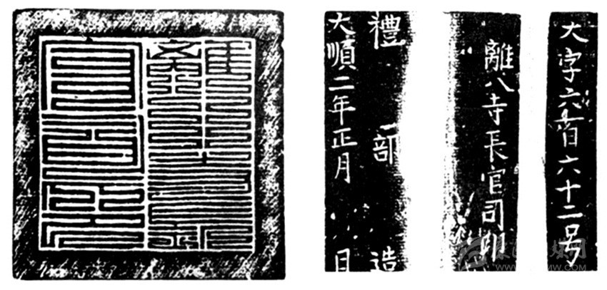 “離八寺官司印”為大西政權(quán)官印,大順二年(1645)鎏金銅制九疊篆印章。高約6CM, 規(guī)格7×7,印章正面邊款鑄文“大字六百六十二號 離八寺長官司印”,側(cè)刻“禮部造 大順二年正月 日”,評為國家一級文物。史書載:“獻(xiàn)忠遍招諸土司,用降人為誘,鑄金印赍之,以易其官?!币虼丝赏茢啵擞榇笪髡?quán)控制川西少數(shù)民族所鑄。