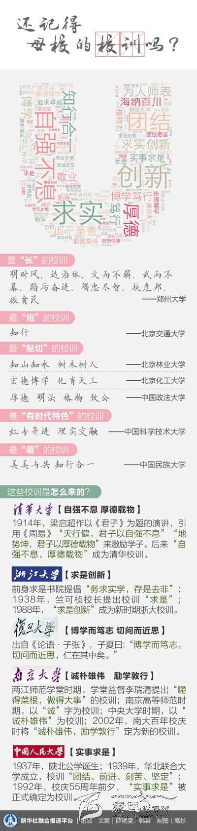 一份對100多所中國高等學府校訓(xùn)的統(tǒng)計顯示,出現(xiàn)頻次最高的詞是“求實”,其次是“創(chuàng)新”、“博學”、“厚德”,一個‘實’字始終貫穿于不同時代、不同環(huán)境的校訓(xùn)之中。