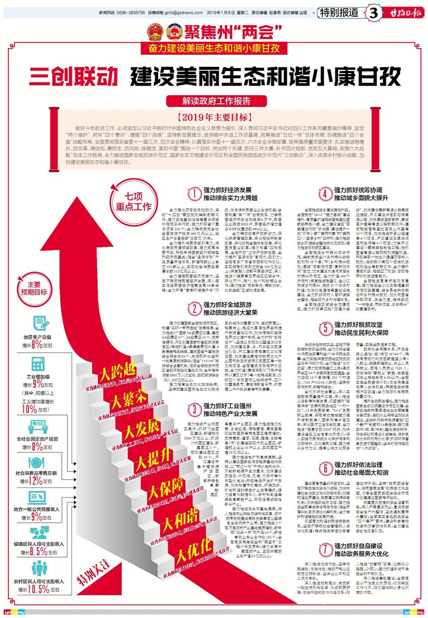 肖友才指出,今年發(fā)展形勢更加復(fù)雜、發(fā)展任務(wù)更加繁重,我們必須緊緊抓住大有可為的重要戰(zhàn)略機(jī)遇期和政策紅利“窗口期”,統(tǒng)籌兼顧、突出重點(diǎn)、突破難點(diǎn),全力保持經(jīng)濟(jì)社會(huì)高速度與高質(zhì)量并重發(fā)展良好態(tài)勢,重點(diǎn)做好以下工作:一是強(qiáng)力抓好經(jīng)濟(jì)發(fā)展,推動(dòng)綜合實(shí)力大跨越。堅(jiān)持把項(xiàng)目投資作為推動(dòng)高質(zhì)量發(fā)展的重中之重,全力確保完成全社會(huì)固定資產(chǎn)投資460億元以上、地區(qū)生產(chǎn)總值突破“三百億”大關(guān);深化商貿(mào)流通領(lǐng)域改革,強(qiáng)力拓展消費(fèi)市場,健全“圣潔甘孜”產(chǎn)品質(zhì)量標(biāo)準(zhǔn)體系,實(shí)現(xiàn)社會(huì)消費(fèi)品零售總額112億元以上;堅(jiān)定不移支持民營經(jīng)濟(jì)發(fā)展,力爭民營經(jīng)濟(jì)市場主體突破6萬戶、民營企業(yè)突破8000戶,民營經(jīng)濟(jì)增加值占GDP比重達(dá)到48%以上;堅(jiān)持以供給側(cè)結(jié)構(gòu)性改革為主線,強(qiáng)力推動(dòng)各項(xiàng)改革任務(wù)落地見效。二是強(qiáng)力抓好全域旅游,推動(dòng)旅游經(jīng)濟(jì)大繁榮。堅(jiān)定不移實(shí)施產(chǎn)業(yè)富民戰(zhàn)略,全力推進(jìn)以全域旅游為核心的生態(tài)優(yōu)先、綠色發(fā)展,強(qiáng)力構(gòu)建“三環(huán)一帶兩濕地”發(fā)展格局,全力打造世界重要旅游目的地和國家全域旅游示范區(qū);堅(jiān)持把建設(shè)國際生態(tài)文化旅游目的地作為重要工作,全力打響中國最美雪山、中國最美濕地、中國最美草原、中國最美藏寨、中國最美漢子“五張名片”,強(qiáng)力培育生態(tài)文化旅游品牌。三是強(qiáng)力抓好工業(yè)強(qiáng)州,推動(dòng)特色產(chǎn)業(yè)大發(fā)展。堅(jiān)定不移實(shí)施工業(yè)強(qiáng)州戰(zhàn)略,堅(jiān)持“優(yōu)先發(fā)展新興產(chǎn)業(yè)、大力發(fā)展農(nóng)特加工產(chǎn)業(yè)、有序發(fā)展電礦產(chǎn)業(yè),大建園區(qū)、建大園區(qū),大建基地、建大基地,大建產(chǎn)業(yè)、建大產(chǎn)業(yè)”思路,強(qiáng)力推進(jìn)產(chǎn)業(yè)向園區(qū)集中;堅(jiān)持以建設(shè)國家級(jí)清潔能源基地為統(tǒng)攬,積極穩(wěn)妥開發(fā)礦產(chǎn)資源,積極發(fā)展戰(zhàn)略性新興產(chǎn)業(yè),強(qiáng)力推進(jìn)電礦向高端集群;堅(jiān)持以建設(shè)現(xiàn)代高原特色農(nóng)牧業(yè)基地為重點(diǎn),深入推進(jìn)農(nóng)業(yè)供給側(cè)結(jié)構(gòu)性改革,強(qiáng)力推進(jìn)龍頭向基地集聚。四是強(qiáng)力抓好統(tǒng)籌協(xié)調(diào),推動(dòng)城鄉(xiāng)面貌大提升。堅(jiān)定不移實(shí)施城鄉(xiāng)提升戰(zhàn)略,堅(jiān)持“七管齊下”“四態(tài)合一”的思路,做強(qiáng)縣城、做優(yōu)鄉(xiāng)鎮(zhèn)、做美村寨,全面推進(jìn)城鄉(xiāng)建設(shè)提檔升級(jí);堅(jiān)定不移實(shí)施鄉(xiāng)村振興戰(zhàn)略,編制完成全州鄉(xiāng)村振興戰(zhàn)略規(guī)劃和18個(gè)縣(市)鄉(xiāng)村振興規(guī)劃,全面推進(jìn)鄉(xiāng)村振興試點(diǎn)示范;堅(jiān)定不移實(shí)施交通先行戰(zhàn)略,強(qiáng)力打好第四輪“交通大會(huì)戰(zhàn)”,全面推進(jìn)區(qū)域綜合交通樞紐;高標(biāo)準(zhǔn)編制災(zāi)后重建實(shí)施方案和項(xiàng)目清單,強(qiáng)力推進(jìn)金沙江白格堰塞湖災(zāi)后恢復(fù)重建。五是強(qiáng)力抓好脫貧攻堅(jiān),推動(dòng)民生民利大保障。堅(jiān)定不移實(shí)施扶貧攻堅(jiān)戰(zhàn)略,堅(jiān)持把脫貧攻堅(jiān)作為最大的政治責(zé)任、最大的民生工程、最大的發(fā)展機(jī)遇,決戰(zhàn)決勝脫貧攻堅(jiān);深入實(shí)施教學(xué)質(zhì)量提升工程,深化醫(yī)療衛(wèi)生體制改革,完善公共文化服務(wù)體系,全力辦好社會(huì)事業(yè);堅(jiān)持就業(yè)優(yōu)先,大規(guī)模開展職業(yè)技能培訓(xùn),全面實(shí)施全民參保計(jì)劃,依法保障退役軍人合法權(quán)益,持續(xù)推進(jìn)城鎮(zhèn)棚戶區(qū)改造,全力做好水電移民安置工作,筑牢社會(huì)保障體系;堅(jiān)定不移實(shí)施生態(tài)文明建設(shè)戰(zhàn)略,嚴(yán)格落實(shí)“三線一單”制度,強(qiáng)力推進(jìn)國家生態(tài)文明建設(shè)示范區(qū)創(chuàng)建,提升生態(tài)民生福祉。六是強(qiáng)力抓好依法治理,推動(dòng)社會(huì)局面大和諧。堅(jiān)定不移實(shí)施依法治州戰(zhàn)略,深化“三區(qū)”維穩(wěn)體系和依法常態(tài)化治理,深入開展反分裂斗爭,建設(shè)更高質(zhì)量的平安甘孜;堅(jiān)定不移把社會(huì)管理納入法治化軌道,鞏固更加和諧的民族宗教關(guān)系;堅(jiān)定不移落實(shí)安全生產(chǎn)“黨政同責(zé)、一崗雙責(zé)、齊抓共管、失職追責(zé)”責(zé)任制,構(gòu)建更大密度的安全監(jiān)管網(wǎng)絡(luò)。七是強(qiáng)力抓好自身建設(shè),推動(dòng)政務(wù)服務(wù)大優(yōu)化。堅(jiān)持依憲施政、依法治政,自覺運(yùn)用法治思維和法治方式推進(jìn)政府工作,堅(jiān)決讓公平和正義成為常態(tài);完成新一輪政府機(jī)構(gòu)改革,形成職責(zé)明確、依法行政的政府治理體系,堅(jiān)決用實(shí)干和效率贏得民心;全面落實(shí)