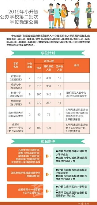 6月17日,記者從成都市教育局獲悉,根據(jù)《成都市教育局關(guān)于2019年小學(xué)畢業(yè)生初中入學(xué)工作的通知》(成教函〔2019〕35號(hào))規(guī)定,中心城區(qū)(包括成都天府新區(qū)[指納入中心城區(qū)招生入學(xué)范圍的區(qū)域]、成都高新區(qū)、錦江區(qū)、青羊區(qū)、金牛區(qū)、武侯區(qū)、成華區(qū)、龍泉驛區(qū)、青白江區(qū)、雙流區(qū)、溫江區(qū)、郫都區(qū)、新都區(qū))公辦學(xué)校第二批次(詳見(jiàn)學(xué)位計(jì)劃表)實(shí)行網(wǎng)上報(bào)名、在符合條件的學(xué)生中隨機(jī)派位錄取的辦法。網(wǎng)上申報(bào)時(shí)間為6月22日10:00至25日17:00;7月2日16:00,成都市招考辦將在服務(wù)平臺(tái)上載入派位結(jié)果,學(xué)校公布錄取學(xué)生名單。