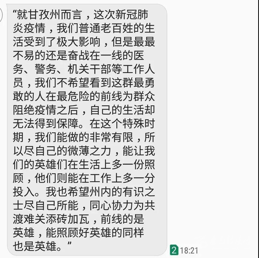 加勇一邊從兜里拿出1000元往鄉(xiāng)干部手中遞,一邊說到:“這個是我跟我兒子捐給國家的,錢不多,我們兩人一個人500,麻煩你們鄉(xiāng)上幫到捐一下。以前,我在擔(dān)任村干部期間,國家給了我和家人很多關(guān)懷和照顧,現(xiàn)在我們?nèi)袊荚邶R心協(xié)力防治新型冠狀病毒感染的肺炎疫情,作為一個老黨員,還是原來的村支部書記,我們一家人想為國家盡點(diǎn)力,這個錢不多,但是我想能有捐一點(diǎn)算一點(diǎn)嘛。”
