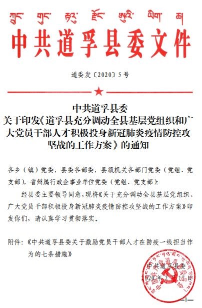 疾風知勁草,板蕩識誠臣。自新型冠狀病毒肺炎疫情防控阻擊戰(zhàn)打響以來,道孚縣各級黨組織和黨員、干部主動擔當作為,積極投入疫情防控最前線,為有力防控疫情蔓延作出重要貢獻。近日,道孚縣委印發(fā)《中共道孚縣委關(guān)于激勵黨員干部人才在防疫一線擔當作為的七條措施》,關(guān)心關(guān)愛、激勵引導廣大黨員、干部、各類人才在疫情防控一線履職盡責、擔當作為、安心戰(zhàn)斗。