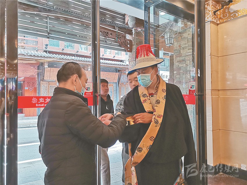 色達(dá)縣演出隊入住邦金麥朵酒店。每天,酒店安保人員多扎準(zhǔn)時出現(xiàn)在門口,提醒演職人員測量體溫、佩戴口罩。“我是酒店的第一關(guān)卡,拉姆是第二關(guān),我倆相互配合,表演節(jié)目的客人住得放心,演出的節(jié)目才會更加精彩。”拿著體溫槍,多扎一臉自豪地說。