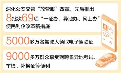 公安交管“跨省通辦”改革深入推進,駕駛證“全國通考”、機動車“全國通檢”等改革措施全面落地,已有9000多萬群眾享受到跨省異地考試、車檢、補換證、處理交通違法等便利,減少多次往返,更好適應人員、貨物、車輛大流動的新形勢。