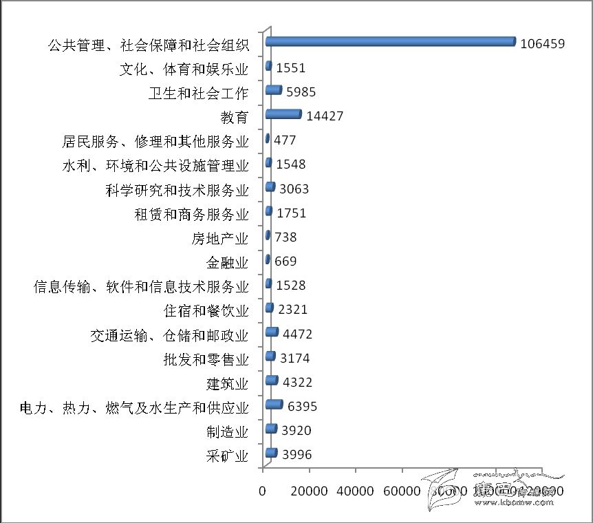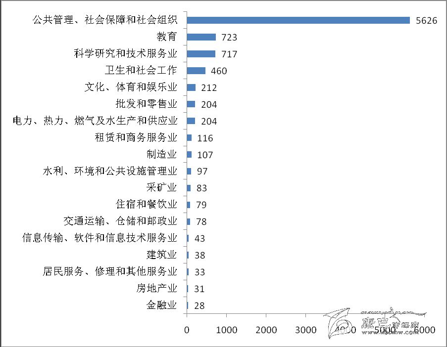 2013年末,在第二產(chǎn)業(yè)和第三產(chǎn)業(yè)法人單位中,位居前三位的行業(yè)是:公共管理、社會保障和社會組織 5626 個,占62.87 %;教育723個,占8.08 %;科學研究和技術服務業(yè)717個,占8.01 %。在有證照個體經(jīng)營戶中,位居前三位的行業(yè)是:批發(fā)和零售業(yè)8349個,占41.69 %;交通運輸、倉儲和郵政業(yè)6462個,占32.27 %;住宿和餐飲業(yè)3102個,占 15.49 %(詳見表1-2)。