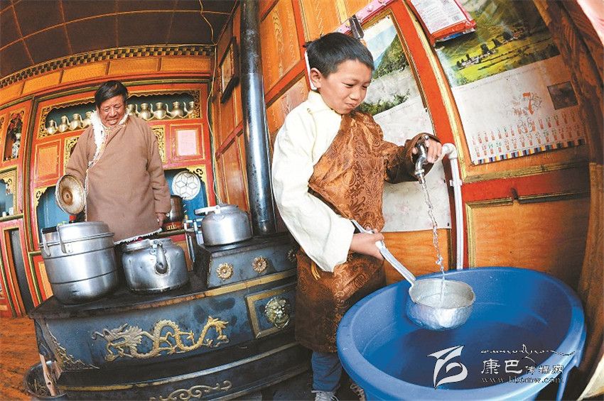 被稱為世界高城的理塘縣,“吃水難”過去一直是當(dāng)?shù)厝罕娚铍y題。2012年實(shí)施對(duì)口援建以來,樂山市和理塘縣把此項(xiàng)工作列為 “一號(hào)民生工程”來抓。2013年,樂山市和理塘縣在位于海拔5000米的理塘縣奔戈鄉(xiāng)境內(nèi)的索絨山上開建奪曲河水庫(kù),2014年7月奪曲河水庫(kù)全部竣工,2015年10月,理塘縣首批2200戶自來水實(shí)現(xiàn)入戶,到今年底縣城中心城區(qū)將全部實(shí)現(xiàn)自來水入戶供水。圖為扎吉和家人正歡喜地接水準(zhǔn)備做飯。