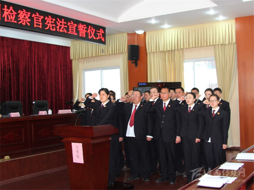本網(wǎng)訊(李銘暇 唐雪萍文/圖)近日,康定市人民檢察院舉行了首批員額檢察官憲法宣誓儀式。19名員額檢察官高舉右手,向憲法和國(guó)旗莊嚴(yán)宣誓。宣誓完畢后,19名員額檢察官簽訂了承諾書(shū)。圖為宣誓現(xiàn)場(chǎng)。