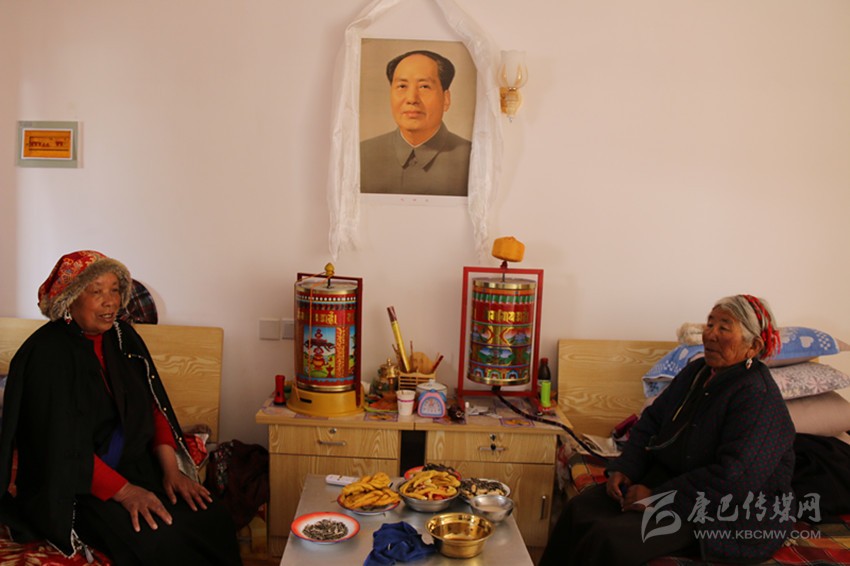 從餐廳出來,記者走進(jìn)了一間15平方米左右的宿舍。兩位老人正坐在各自的木床上看電視,墻上掛著的液晶電視是連著機(jī)頂盒的。兩床之間,放著藏桌和床頭柜,藏桌上有瓜子、花生、酥油果子、牛肉等食品,亞瑪翁青老人熱情地說:“因?yàn)檎谶^藏歷新年,這些都是福利院為我們備的年貨,你也嘗嘗!”。房間里最引人注目的便是掛在床頭柜上方的系著哈達(dá)的毛主席畫像,兩位老人指著毛主席畫像動(dòng)情地說:“毛主席、共產(chǎn)黨是我們的恩人,看著他的畫像我們安心?!贝送猓块g里還有衣柜、配有馬桶的獨(dú)立廁所和盥洗臺,毛巾、漱口盅、掃把、拖把都整齊地放在對應(yīng)位置。亞瑪翁青笑著說:“我們住的房間都趕得上縣城里的賓館了。”