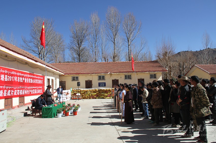 在農(nóng)科所院壩,擺放著縣委政府多方籌資,縣農(nóng)牧和科技局調(diào)運(yùn)和貯備脫毒馬鈴薯種60萬公斤,青稞良種30萬公斤、農(nóng)膜10噸、肥料120噸、各類蔬菜油菜良種3000公斤,35萬元的黑木耳菌種,分發(fā)給24個(gè)鄉(xiāng)鎮(zhèn)、37個(gè)脫貧村。為趕這趟“理塘縣2017年農(nóng)牧產(chǎn)業(yè)扶貧放心農(nóng)資發(fā)放儀式”、“理塘縣成片成帶推進(jìn)特色產(chǎn)業(yè)發(fā)展啟動(dòng)儀式”,降央吉稱專門起了個(gè)大早,開著拖拉機(jī)“趕”了兩個(gè)小時(shí)到了農(nóng)科所。