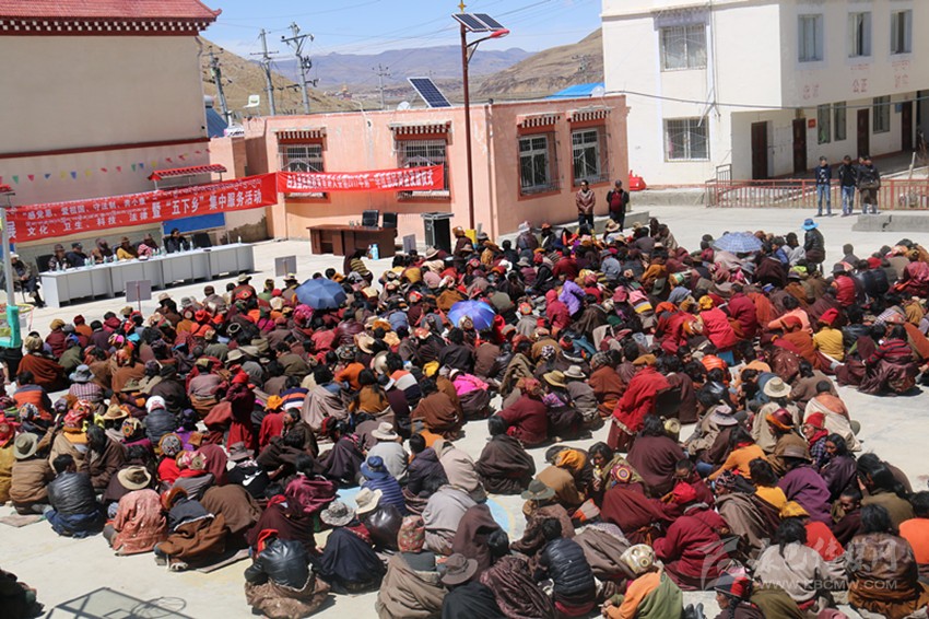 白玉縣牧區(qū)納塔鄉(xiāng),高原烈日下,1000多牧民和僧人盤腿坐在地上,聚精會神聆聽,麥克風(fēng)里傳出抑揚(yáng)頓挫的藏語,本地諺語、民間故事配合著扶貧政策、法律法規(guī),通過一個(gè)個(gè)生動的比喻,回響在牧民耳畔。