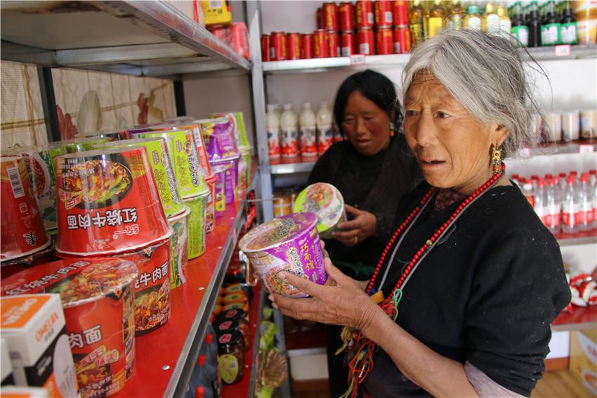 貨架上的貨物琳瑯滿目,價(jià)格與縣城大超市一分不差,還節(jié)省了路途奔波。“家門(mén)口就能買(mǎi)到東西,還又好又便宜,安逸。開(kāi)展精準(zhǔn)扶貧,硬是為大家解決了大困難。” 村民格瑪拉措道出了村民們的感激。大家共同商議決定把這超市叫做“洛蝦村感恩超市”。