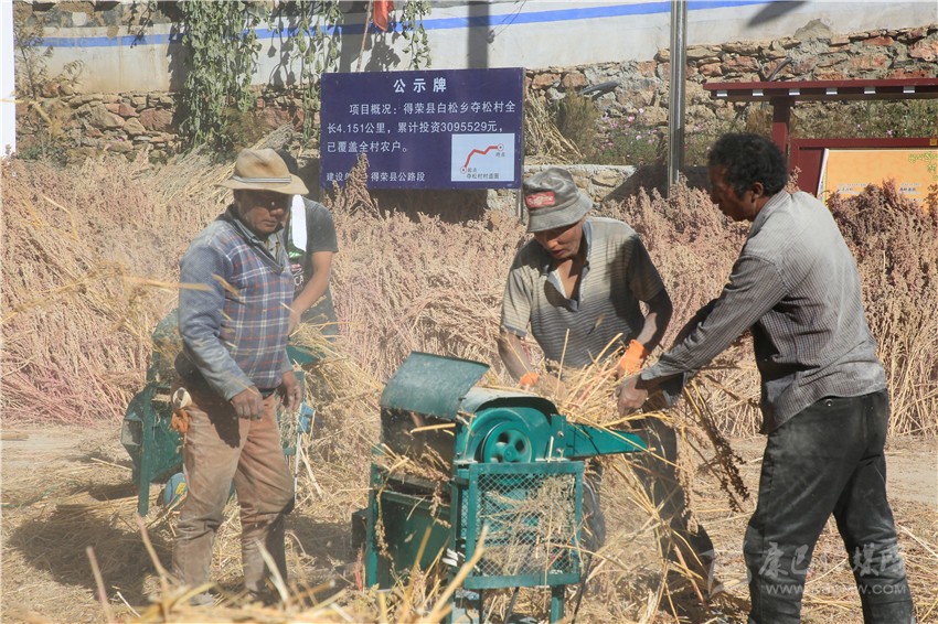 金秋的陽(yáng)光熾熱溫暖,得榮縣白松鎮(zhèn)奪松村一片祥和安寧。11月10日,村民們正在村活動(dòng)室的院壩里脫粒藜麥,豐收的喜悅寫在忙碌的村民的臉上。“大家加油干,把藜麥交給公司,立馬可以拿到現(xiàn)錢?!眾Z松村委會(huì)副主任四郎都遷高興地說(shuō),盤點(diǎn)收成,今年又是一個(gè)豐收年。
