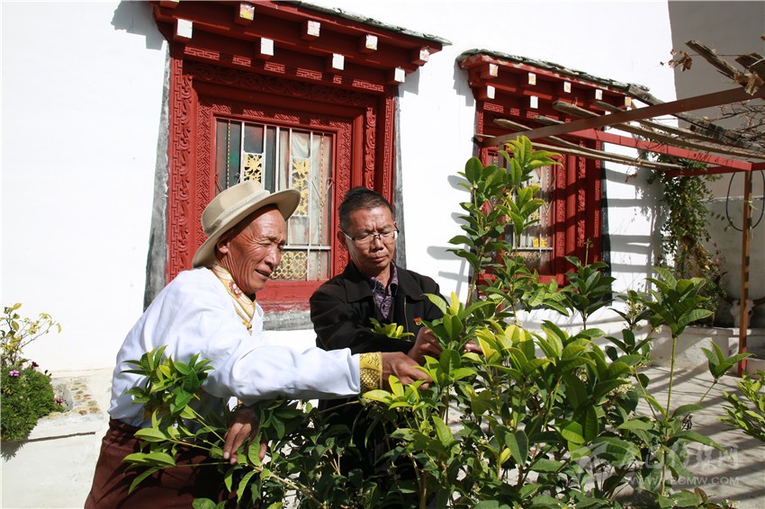 11月10日,在得榮縣農(nóng)牧農(nóng)村和科技局的駐村農(nóng)技員羅思富的帶領(lǐng)下,記者走進(jìn)了因都?jí)未?5歲的村民降巴曲增家。拾級(jí)而上,院子里無花果、草莓、桂花、藏橘、桃樹、梨樹、蒜苗,綠色滿園。三層樓的住房裝修后,美觀大方。降巴曲增把記者迎到亭子里落座,端上香噴噴的酥油茶后,老人打開了話匣子。