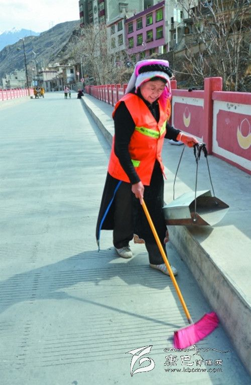 由于丹巴縣城素有風城之稱,五條山谷的風仿佛都聚集在了志瑪大姐負責的濱河路上,風的匯聚也成了垃圾的集中點,當時在分配工區(qū)時,許多清潔工都唯恐這段路落在自己頭上,可志瑪大姐卻主動承擔起這段路面的清潔任務,每天其他清潔工人還在睡夢中時,她就早早的起床,開始一天的工作。烈日當空時,別人都躲在家里乘涼時,志瑪大姐還在路段上來回的巡視,時刻保持路面的清潔。冬日來臨寒風呼嘯,城市里的人們都蜷縮在蝸居里開著空調(diào)、電暖氣等,享受著天倫之樂時,志瑪大姐卻穿著厚厚的冬裝,戴著手套在濱河路上費力的掃著地,她從來沒有叫過一聲苦,有人勸她放棄這段路,她總是笑著說:“國家給了我工資,我就要好好的干,再說城市如果沒有我們這些清潔工,那市民將會生活在臟亂差的環(huán)境里,將有損丹巴這座美麗小城鎮(zhèn)的形象。”