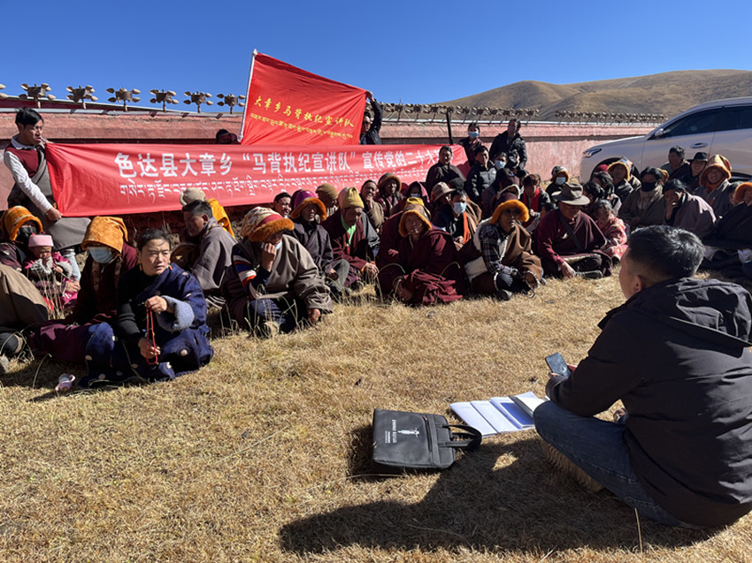 “針對(duì)色達(dá)高寒偏遠(yuǎn)、地廣人稀,牧區(qū)群眾生活居住較分散的情況,我們調(diào)配縣鄉(xiāng)村三級(jí)紀(jì)檢監(jiān)察力量,逐步組建起精通藏漢雙語(yǔ)、熟悉紀(jì)法知識(shí)、擅長(zhǎng)群眾工作的馬背執(zhí)紀(jì)宣講隊(duì),把黨的聲音傳遞到云端藏寨、天邊牧場(chǎng)?!鄙_(dá)縣紀(jì)委書(shū)記、監(jiān)委主任陳玉龍介紹,黨的二十大以來(lái),宣講隊(duì)已開(kāi)展宣講活動(dòng)20余場(chǎng)次,推動(dòng)為群眾辦實(shí)事10余件,解決困難訴求20件。