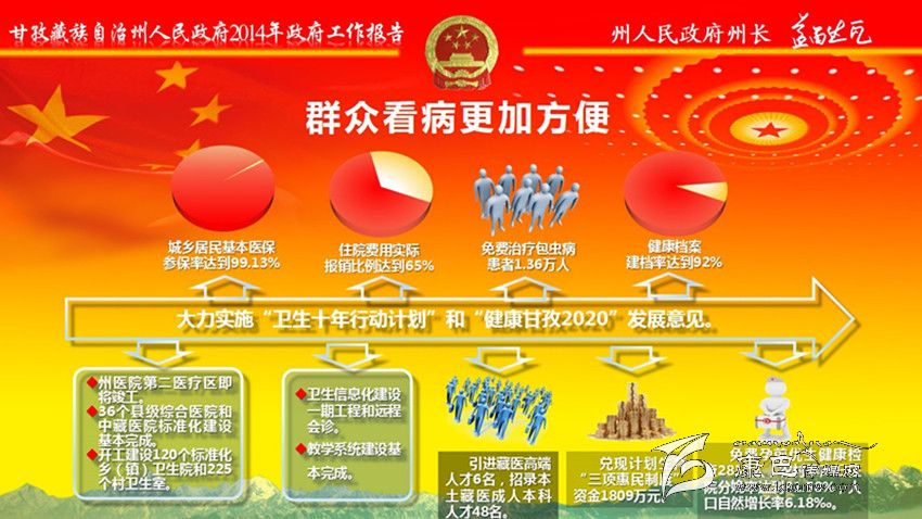 全力推進衛(wèi)生計生事業(yè)。繼續(xù)實施“衛(wèi)生十年行動計劃”和“健康甘孜2020”發(fā)展意見。確??偼顿Y2.8億元的州醫(yī)院第二醫(yī)療區(qū)竣工使用,實現(xiàn)“再造一個州醫(yī)院”目標;投資1.7億元,建設(shè)標準化鄉(xiāng)(鎮(zhèn))衛(wèi)生院50所、村衛(wèi)生室200個;強力推進衛(wèi)生信息化建設(shè)工程,免費定向培養(yǎng)藏醫(yī)藥本科生50名;啟動州醫(yī)院三級甲等、州藏醫(yī)院三級乙等創(chuàng)建工作,扎實開展技術(shù)大練兵、設(shè)備使用大提升、健康管理全覆蓋“三大行動”,著力提高州、縣、鄉(xiāng)醫(yī)療機構(gòu)醫(yī)技人員素質(zhì)和管理服務(wù)水平。落實衛(wèi)生計生惠民政策,提高計劃生育公共服務(wù)覆蓋面,人口自然增長率控制在7.5‰以內(nèi)。