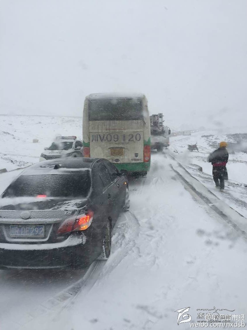 康定縣318國道折多山中橋段從昨(9)日下午17點(diǎn)左右下起了鵝毛大雪,由于是大風(fēng)雪來得突然,絕大多數(shù)車輛都未安裝防滑鏈,加之路滑、視線不佳等因素,折多山路段上下行方向全線堵塞,車輛排行數(shù)公里長。
