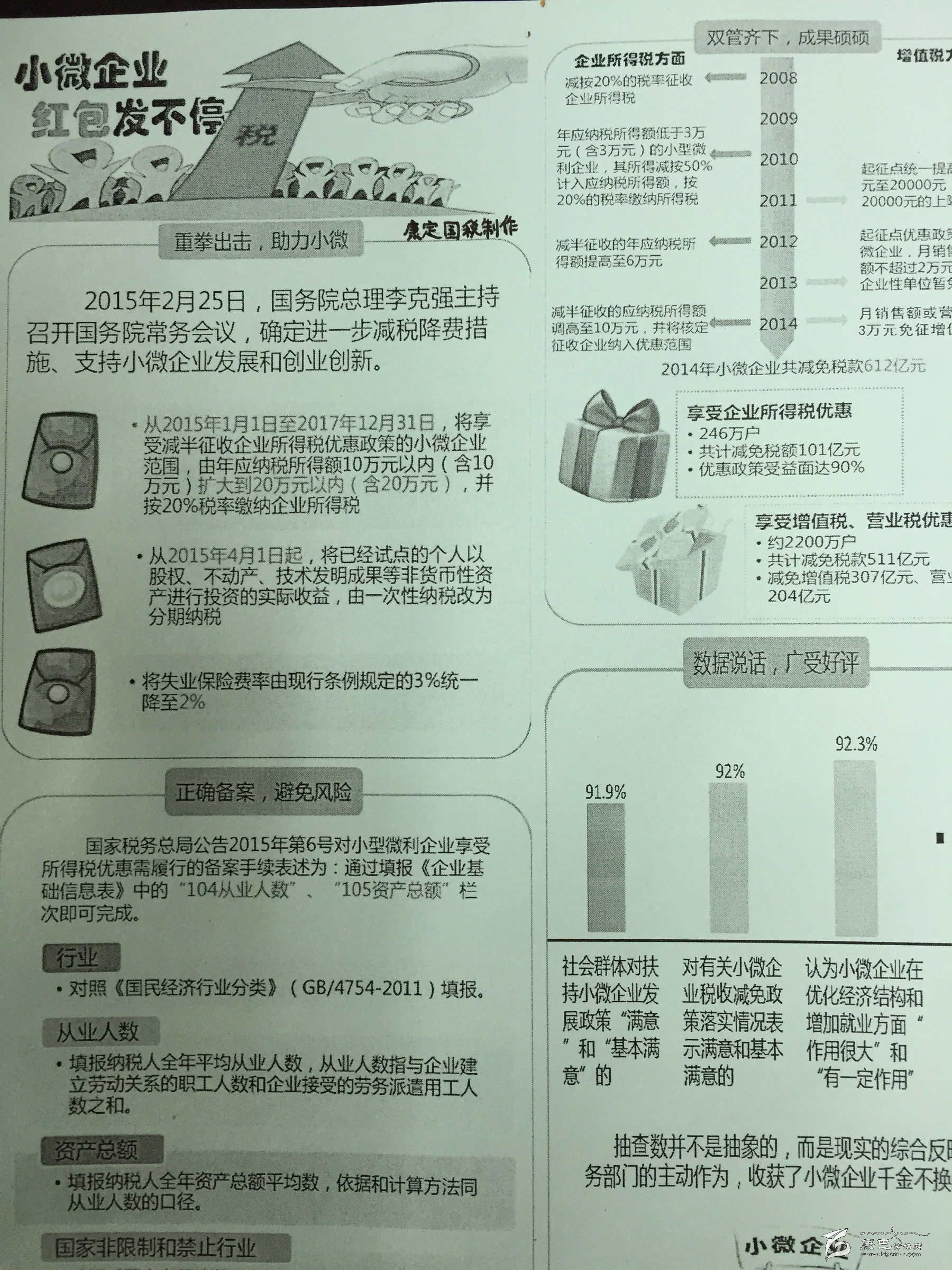 九龍縣國(guó)稅局倡導(dǎo)稅務(wù)人員和納稅人代表組建“小微企業(yè)納稅服務(wù)志愿小分隊(duì)”,大力宣傳落實(shí)小微企業(yè)稅收優(yōu)惠政策,使該局享受小微企業(yè)稅收優(yōu)惠政策的納稅人從124戶增加至133戶,享受面達(dá)到100%。