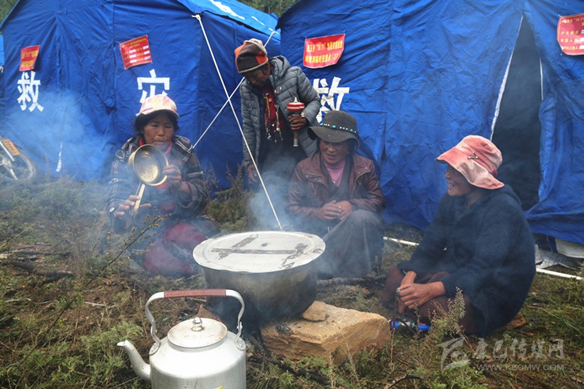 曲珍、曲西和幾個伙伴正在燒著開水?!斑@是到安置點后我第一次生火。前兩天吃干糧喝礦泉水,讓喝慣了酥油茶的我們很不適應?!鼻湔f。