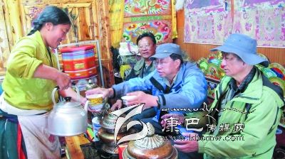 位于宗塔草原“大盆地”東邊山坡的降巴牧場在隊員們的心里也留下了深刻的印記。15日早上5點(diǎn)半隊員們就出發(fā)上了降巴牧場。朝霞映紅了天邊,紅云罩著青草牛糞味飄香的草坡。比采風(fēng)隊員們起得更早的牧人已擠完了牛奶,一個僅10 歲的女孩正在草坡上拾牛糞;牛毛帳篷里,勤勞的牧婦已打開了牛奶分離器開始分離酥油了……一問,方知牧民們今晨4點(diǎn)就起床勞作,干完早上的活兒,他們要趕到三公里遠(yuǎn)的“盆地”耍壩子,看賽馬。這個牧場靜謐潔凈得令人稱奇,青青的草坡上絕少有垃圾存留,沒見到一只兇惡的牧犬;按季節(jié)劃分的草場由整潔的網(wǎng)圍欄圈開,分隔有致;牧人舉家出門,連帳篷門也不掩,據(jù)說這里沒有偷盜發(fā)生,家人和諧;古老、平和的氣氛中,晨風(fēng)輕拂,野花青草搖曳,輕柔的晨霧中偶而傳來兩聲牛哞,讓人頓感心靜如水。對于長期居住城市的人來說,這里無疑是“幽雅天堂”了。
