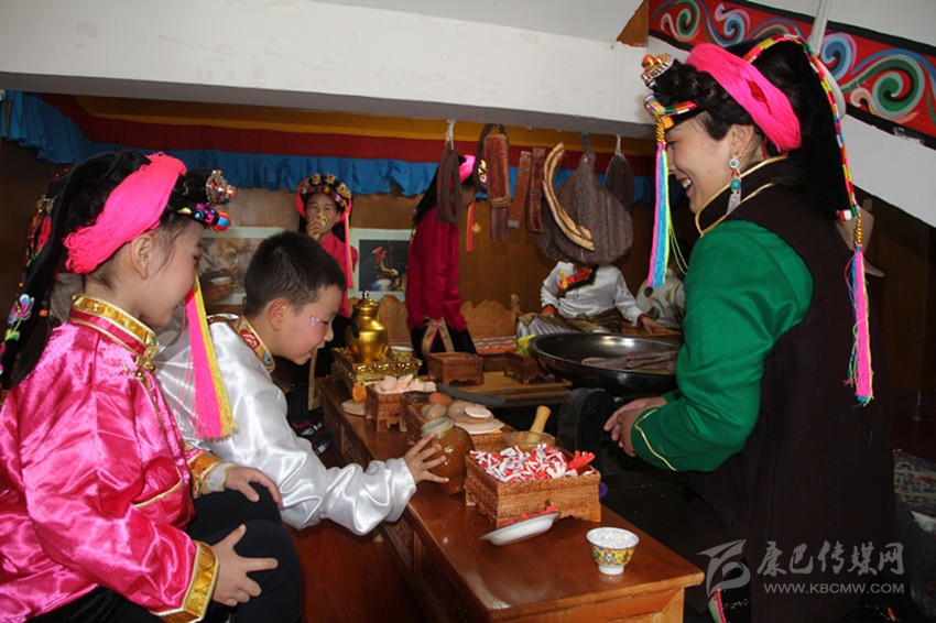 筆者正在參觀時,老師帶領著一群可愛的孩童走進鍋莊房內(nèi)。孩子們脫下鞋襪,盤膝坐在藏床上,一邊做著喝酥油茶的樣子,一邊唱起古老的嘉絨歌謠。稚嫩的嗓音中,遠古文化煥發(fā)出新時期的獨特魅力。老師則坐在火籠邊,不斷地“忙碌”著。孩子們“吃飽喝足”后,走到房屋主人的扮演者老師面前鞠躬致謝,文明禮儀也得到了升華。